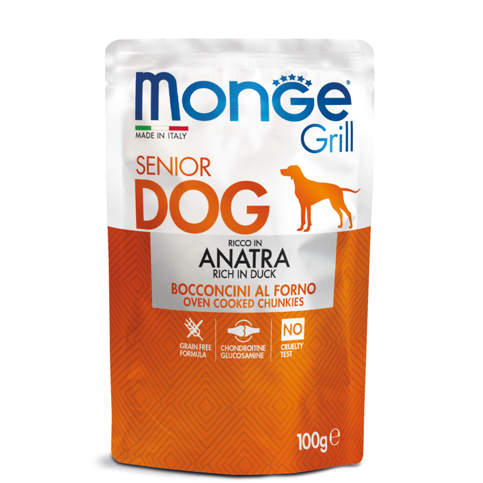 “Monge Grill Duck – вологий корм з качкою для дорослих собак всіх порід. Це соковиті шматочки звіжого м’яса, приготованого на грилі.