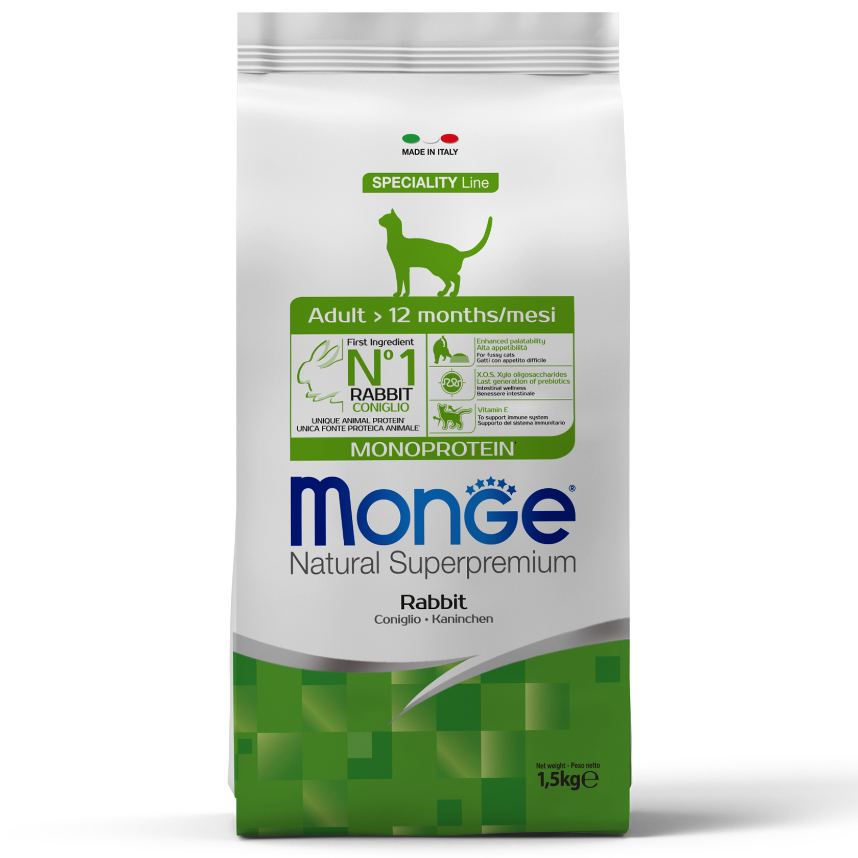 “Monge Natural Super premium Monoprotein Rabbit – це сухий монобілковий раціон з лінійки Speciality Line для дорослих котів з кроликом.