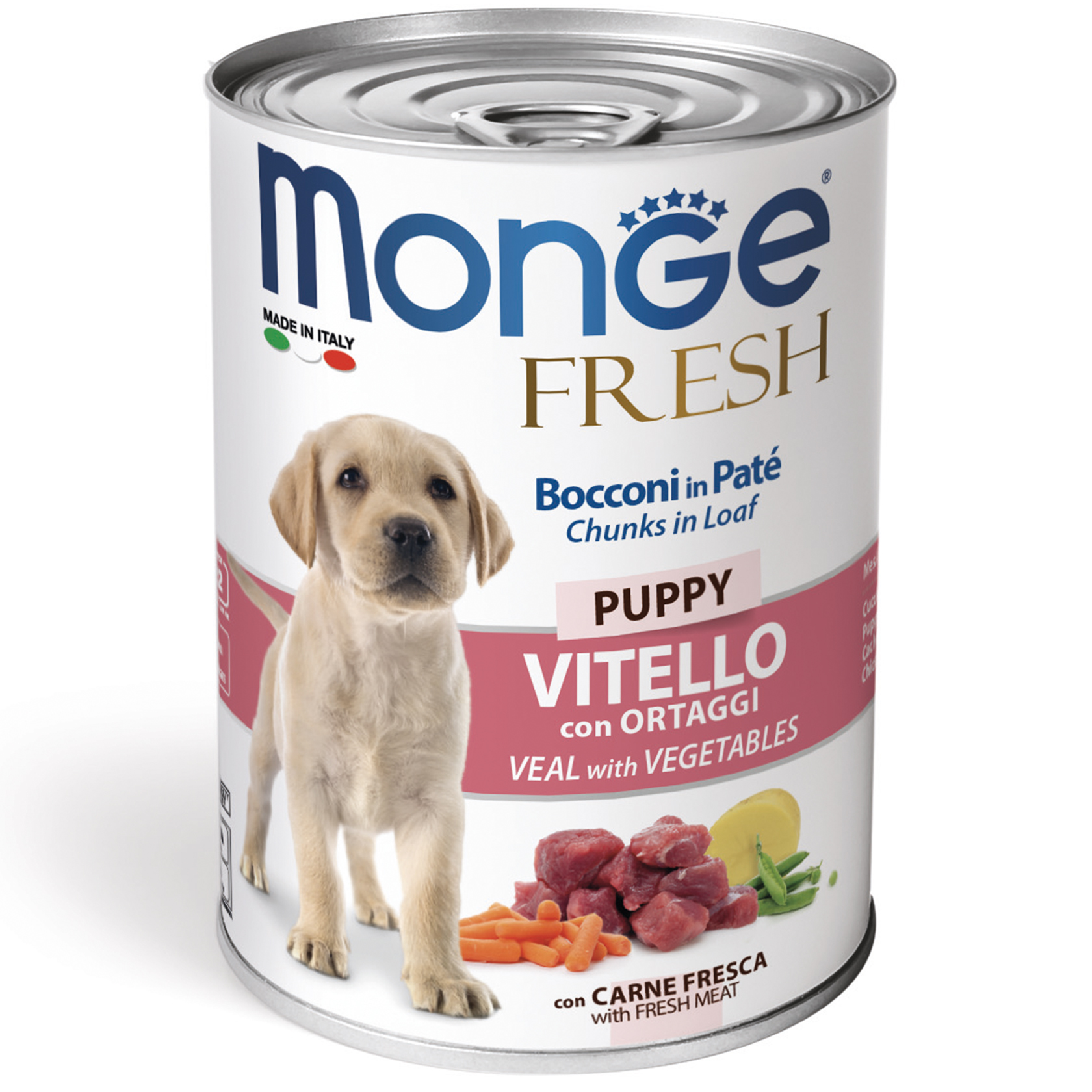 “Monge Dog FRESH з Chunks in Loaf – консерви для цуценят. М’ясний рулет з шматочкиами телятини і овочами. Повнораціонний корм для цуценят.