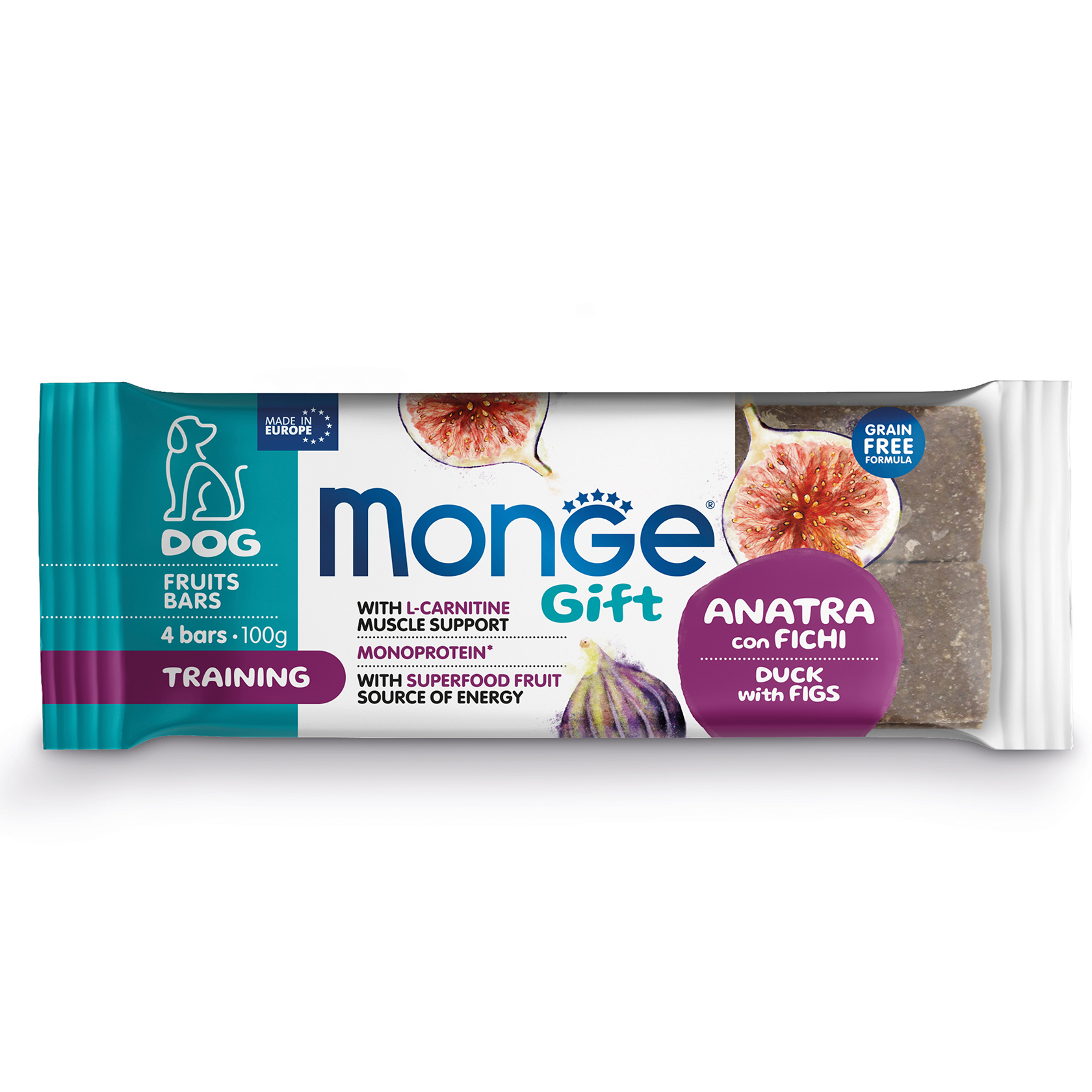“Monge GIFT TRAINING Dog DUCK WITH FIGS – це додатковий корм Для дорослих собак. Спеціально розроблений для хорошого самопочуття вашого собаки. L- карнитин для підтримки м’язової маси. Продукт, створений без злаків, з одним джерелом тваринного білку*, качкою, цінним джерелом легкозасвоюваних білків з високою біологічною цінністю. Формула збагачена вітамінами для щоденної життєвої сили і збалансованою енергією, підтримка фізичної активності. Включення фруктов-суперпродуктов, таких як інжир, джерела енергії, корисного для фізичної активності, є результатом досліджень “Made in Italy”, спрямованих на поліпшення якості життя Ваших собак. Без додавання штучних барвників і цукру. *Може містити сліди інших джерел білку.”